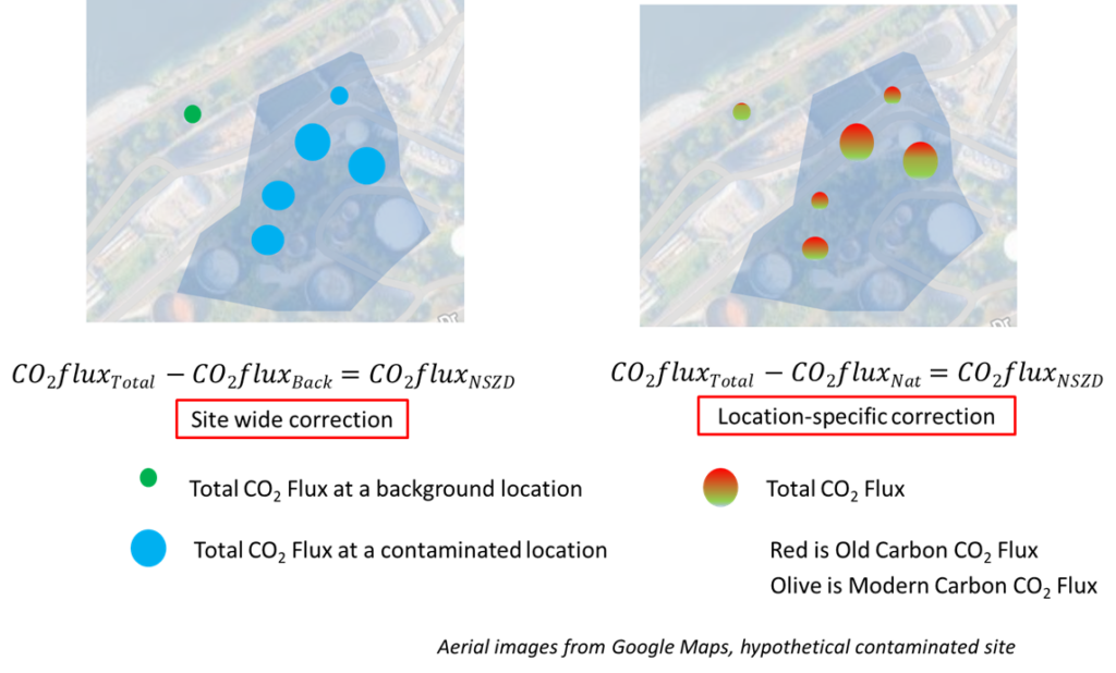 For example, uncontaminated soils naturally produce CO2. Similarly, ambient temperature variations generate heat fluxes in soil that interfere with the heat flux of the biogenic heat from Equation 2. Different NSZD rate measurements deal with these interferences (the separation of signal from noise) in distinct ways. Figure 2 shows two different implementations of Equation 4. The first one is the so-called background location correction, in which a site-wide value is subtracted from the values obtained at the contaminated locations. For example, an NSZD rate measurement based on surficial CO2 flux can be based on the total CO2 flux, in which the total CO2 flux at a background location (if available) is subtracted from the total CO2 flux at the five contaminated locations shown. The second practice, not available for all methods, consists of applying a location-specific correction. When this occurs, the total CO2 flux at each location can be calculated by using a radiocarbon (14C) analysis to differentiate the modern carbon CO2 flux (noise) and the fossil fuel CO2 flux (signal). The radiocarbon analysis has long been recognized as the most reliable correction (API, 2017; CRC Care, 2018). A study based on data from passive CO2 traps found that the assumption of a single, site-wide value is rarely met and using it might result in large measurement error compared to the location-specific correction using the radiocarbon analysis (Zimbron, 2022).