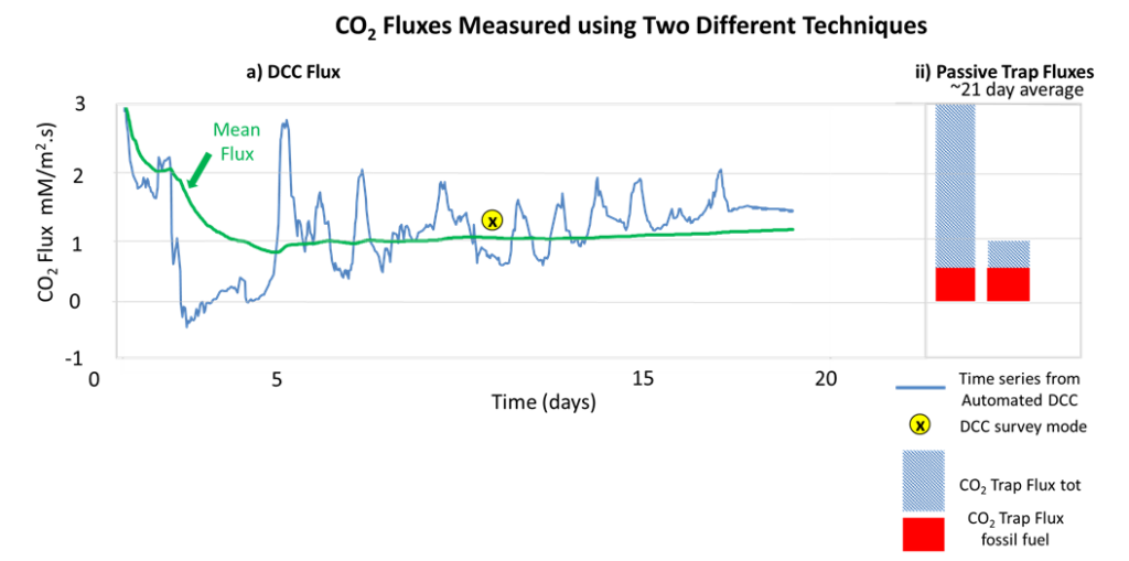 Differences in measured NSZD rates using multiple techniques can be difficult to reconcile, especially when the basis for these measurements is different. Many of the available methods are single time measurements (such as DCC), while others are time-integrated measurements (the passive CO2 trap). The way that these measurements account for the sources of noise is also different. Some include a site-wide single value (the background location), while others use a location-specific value (for example the radiocarbon correction for CO2 fluxes). Signal shredding and the lack of discussion about the characteristic scale of these processes create a very uneven field for these different techniques. No wonder practitioners have difficulty reconciling different measurement techniques. This should not be taken as a lack of repeatability of the methods themselves. For example, radiocarbon-corrected CO2 fluxes using passive CO2 trap data are within a few percentage points of each other (see Figure 3).